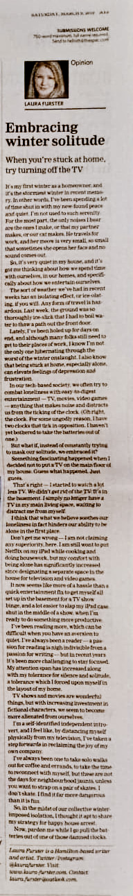 Laura Furster is a Hamilton-based writer and artist. Twitter/Instagram: @laurafurster. Visit: www.laura-furster.com. Contact: laura.furster@outlook.com.